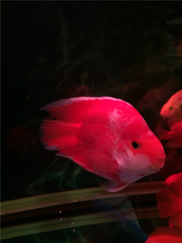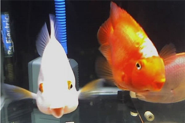 6 、红白鹦鹉鱼。红白鹦鹉鱼就是继承了红白花魔鬼的基因,体色红白参杂,上品的红白鹦鹉鱼除了体型的要求外,体色要求红白分明,边界清晰,最好分布有特点,如白头翁、丹顶等等。如果红白互相渗透、颜色不分明则是下品。