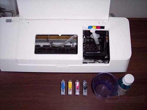 14、用针筒抽取2ML左右清通液,(6色打印机相应使用量为3ML),在黑色墨柱里慢慢加入0.3至0.4毫升,彩色每个进墨柱里加入0.2至0.3毫升,针筒内余下的0.5至1.0ML全注入在洗车槽内,然后装回墨盒,马上将墨车移到停车位(即洗车槽上,打印机关机时墨车的那个位置),.........接下来什么也不要做,千万不要开打印机电源,耐心等8小时以上。8小时以后,或第二天,再开打印机电源,在电脑的打印机属性里-“打印机首选项”-“维护”-“打印头清洗”,用软件清洗一次,仅一次,检查打印头喷嘴,对比在清洗前打印的,仔细对比检查分析喷嘴线条,如果还不理想,再重复一遍清洗,再检查。