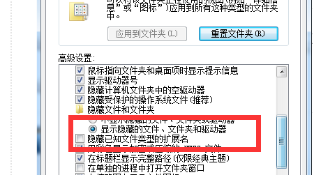 4、进入文件夹选项的查看界面,下面有一个高级设置,在设置里面的【显示已隐藏文件,文件夹,驱动器】选项前打勾,然后点击保存。
